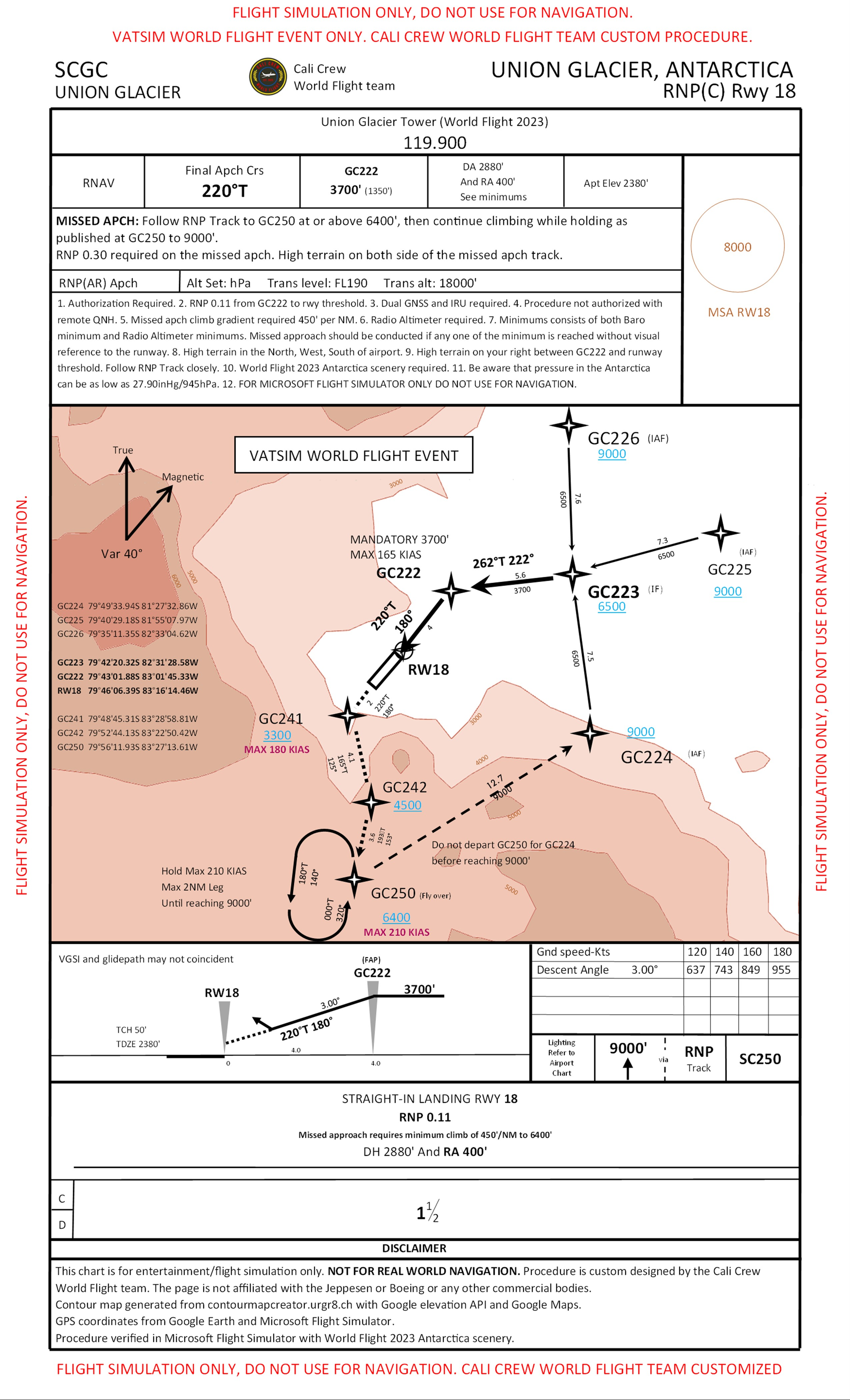 The procedures below are custom designed for WorldFlight 2025 using publicly available information. They are for Flight Simulation Only. Thank you to Cali-Crew for their help with the approach chart.